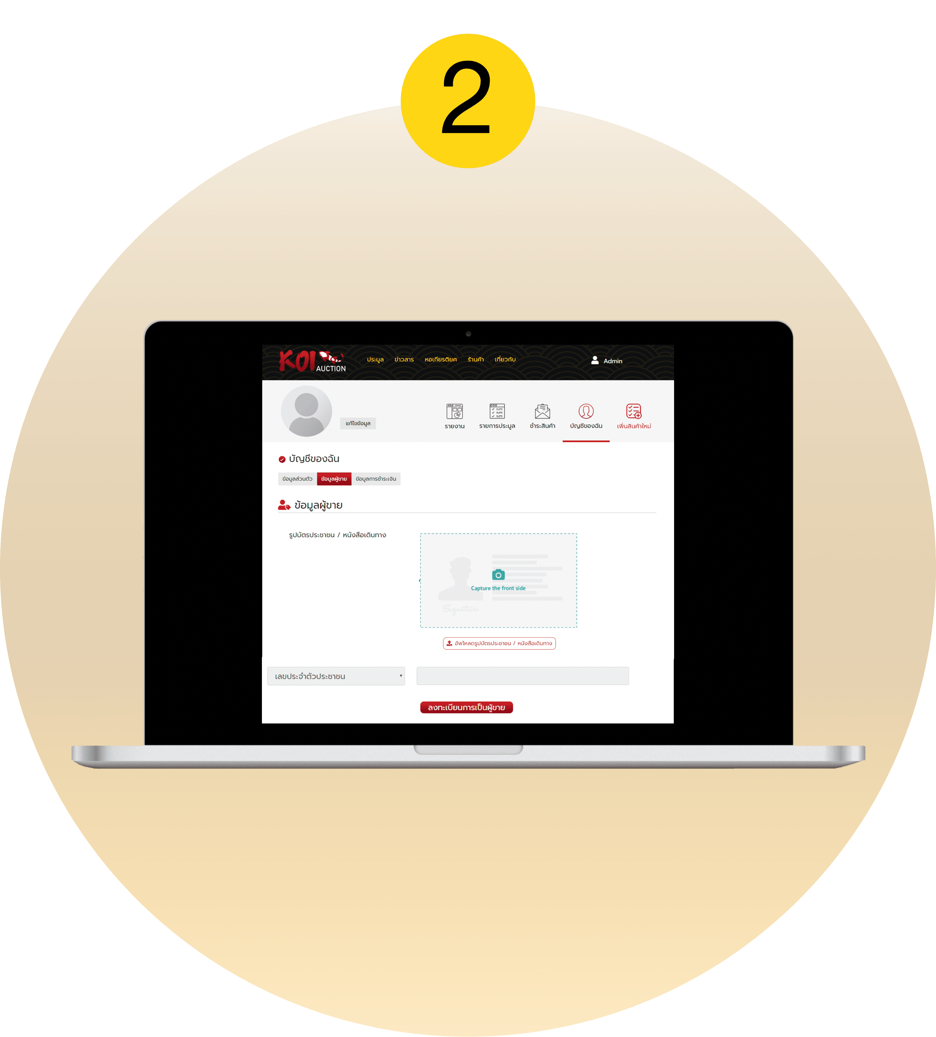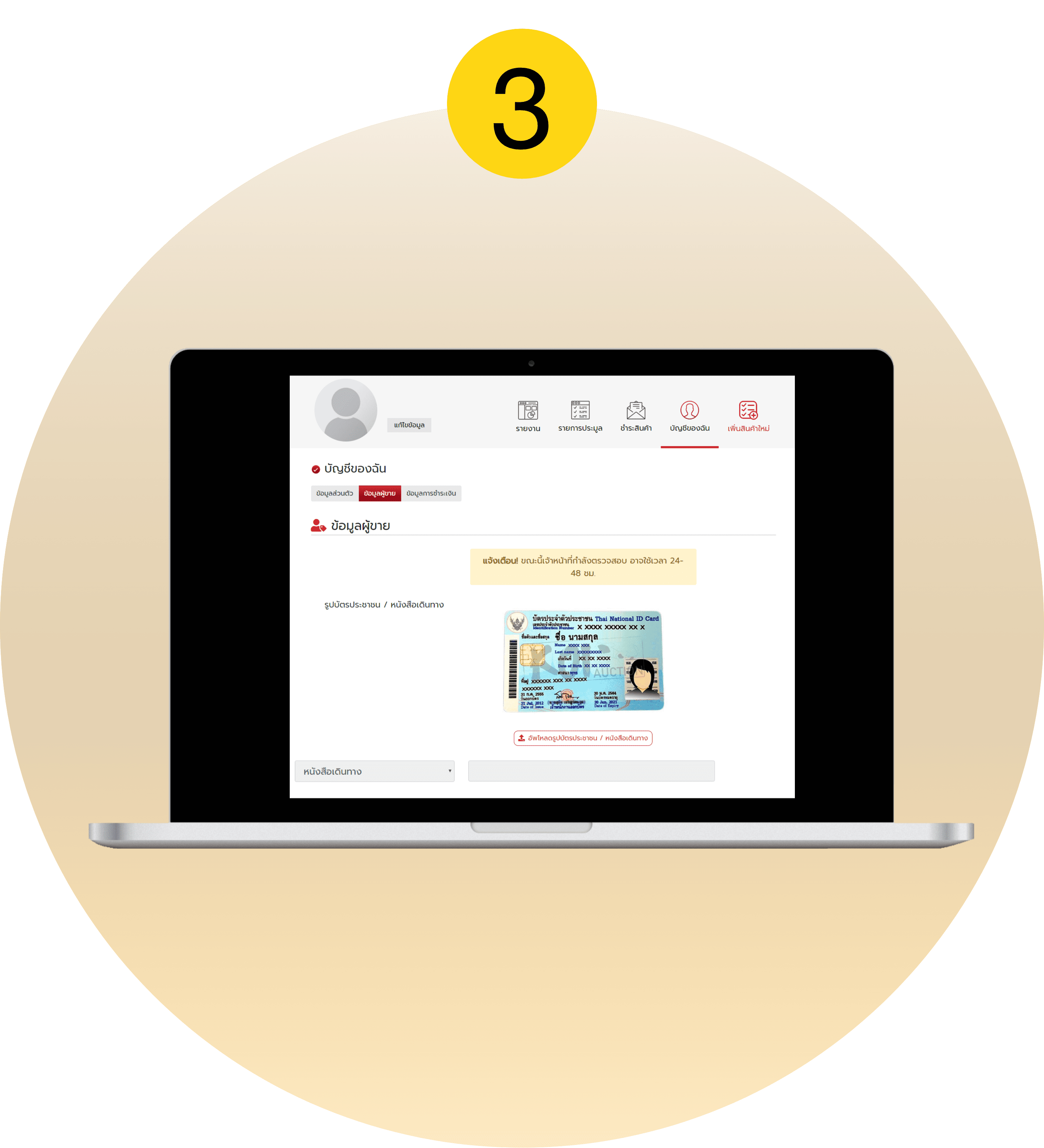 เลือกแถบ "ข้อมูลผู้ขาย" จากนั้นอัพโหลดรูปภาพ และเลขบัตรประจำตัวประชาชนหรือหนังสือเดินทางของท่าน